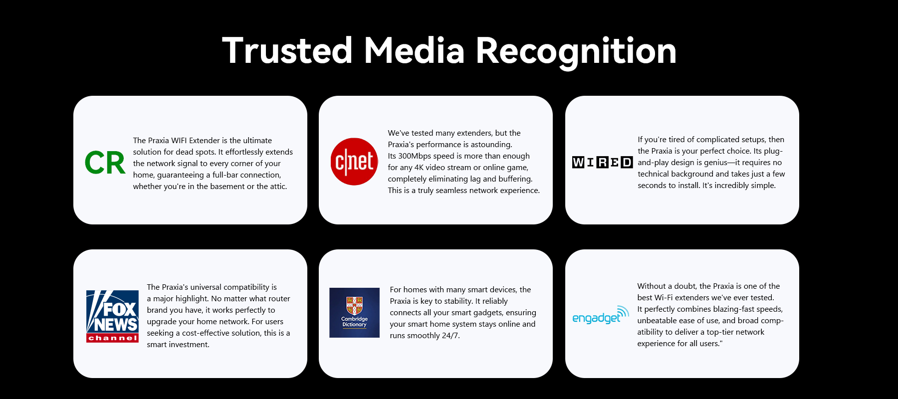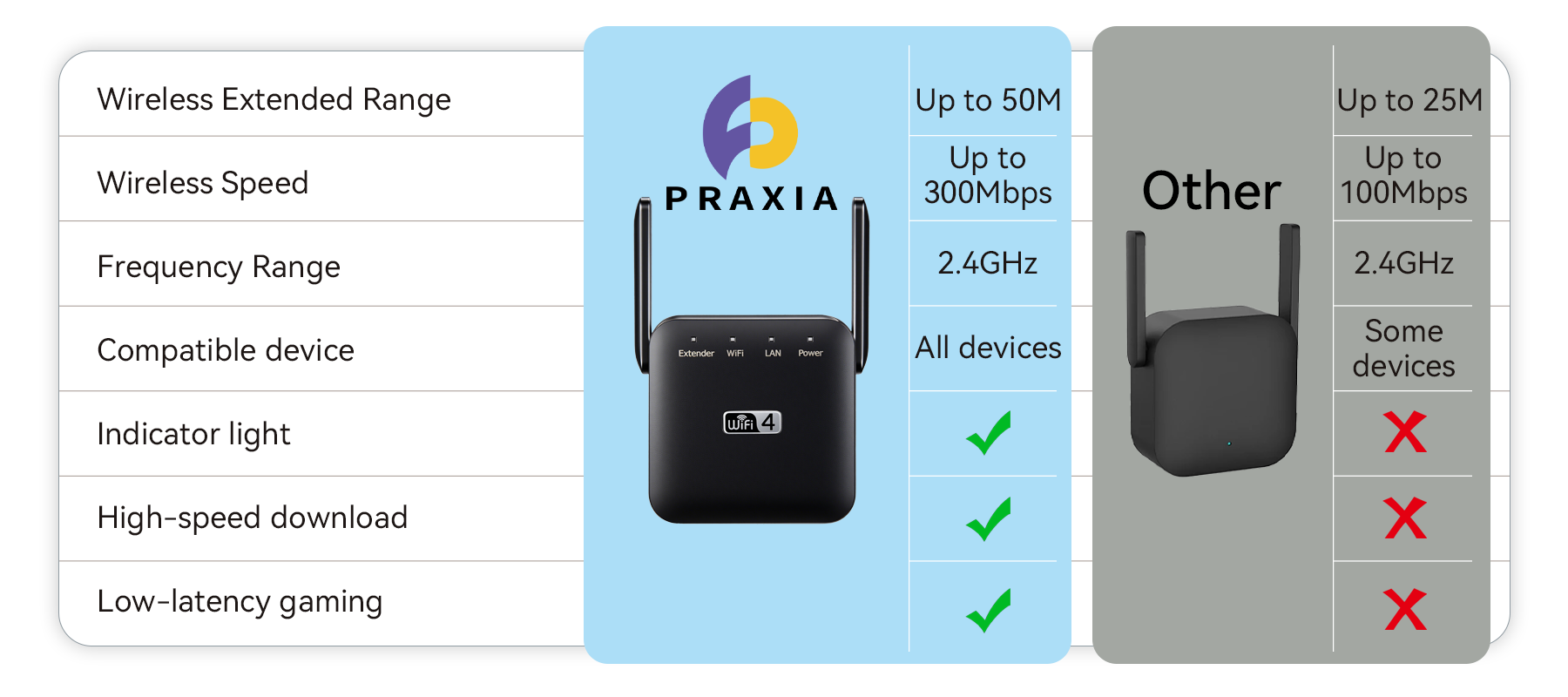 Praxia WiFi Extender: Delivers blazing-fast, seamless coverage to every corner of the home. Stream, work, and game without lag.