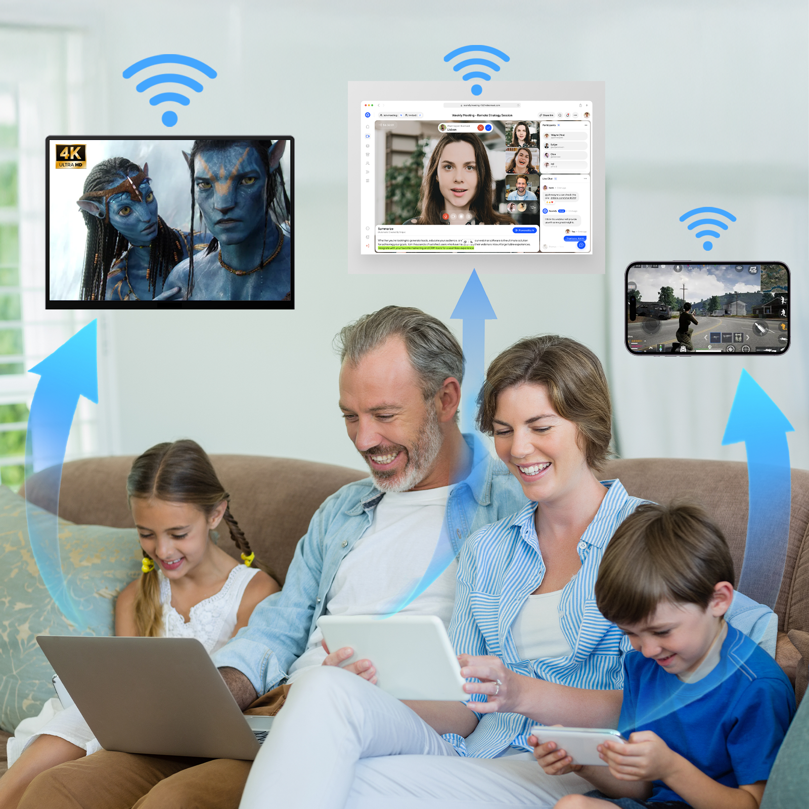 The powerful bandwidth and stable signal ensure every device gets the best possible connection. Even when the whole family is simultaneously streaming HD video, playing online games, or downloading large files, your network stays fast and smooth, completely eliminating network congestion.